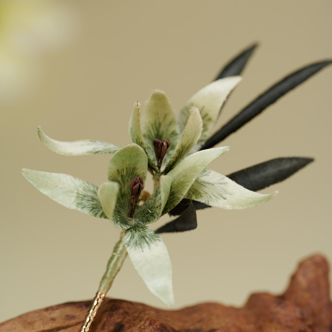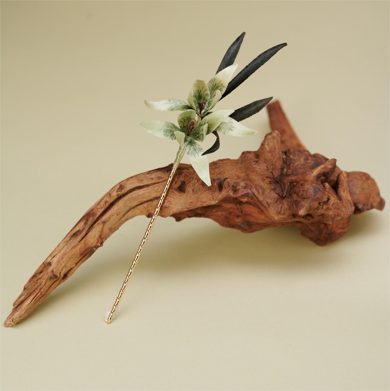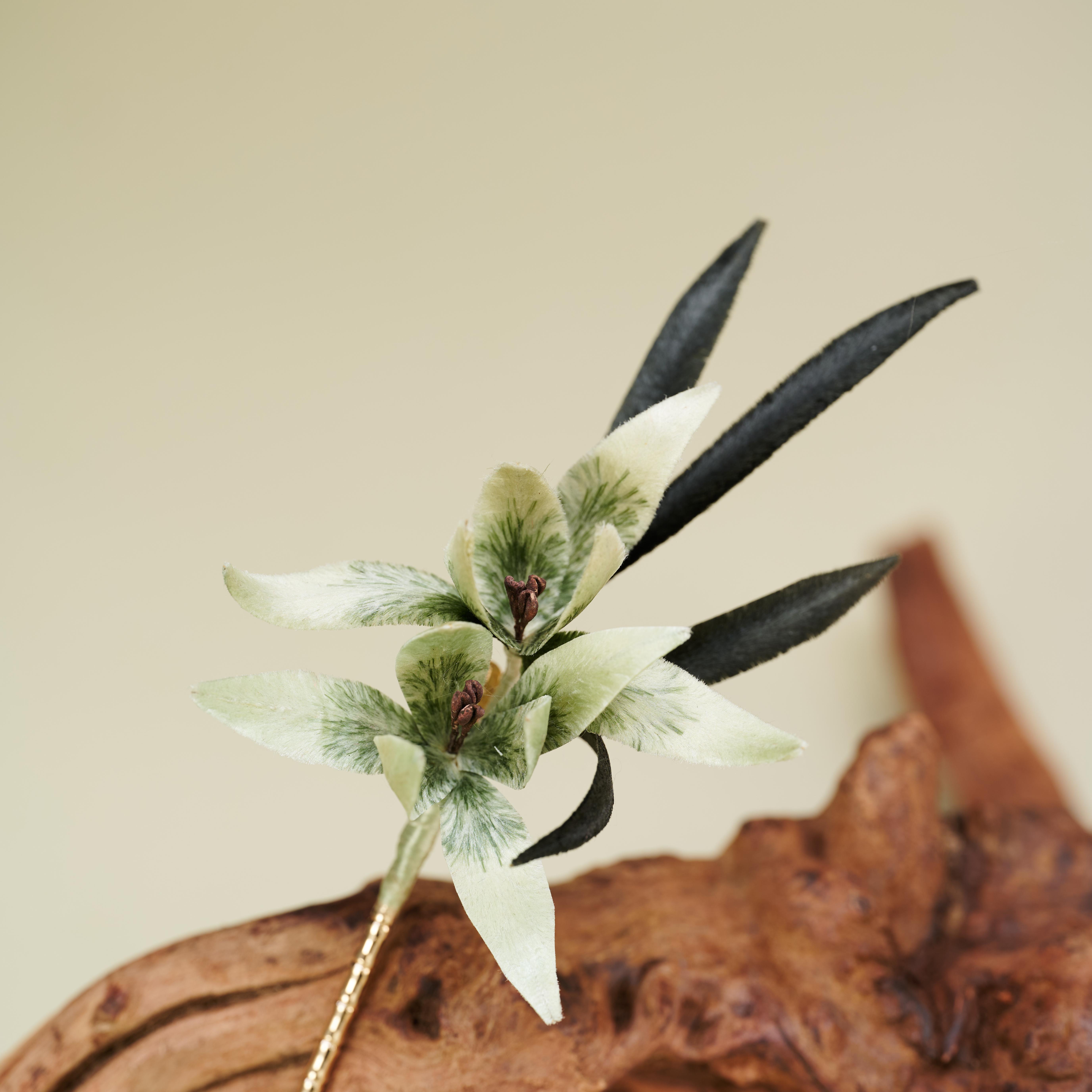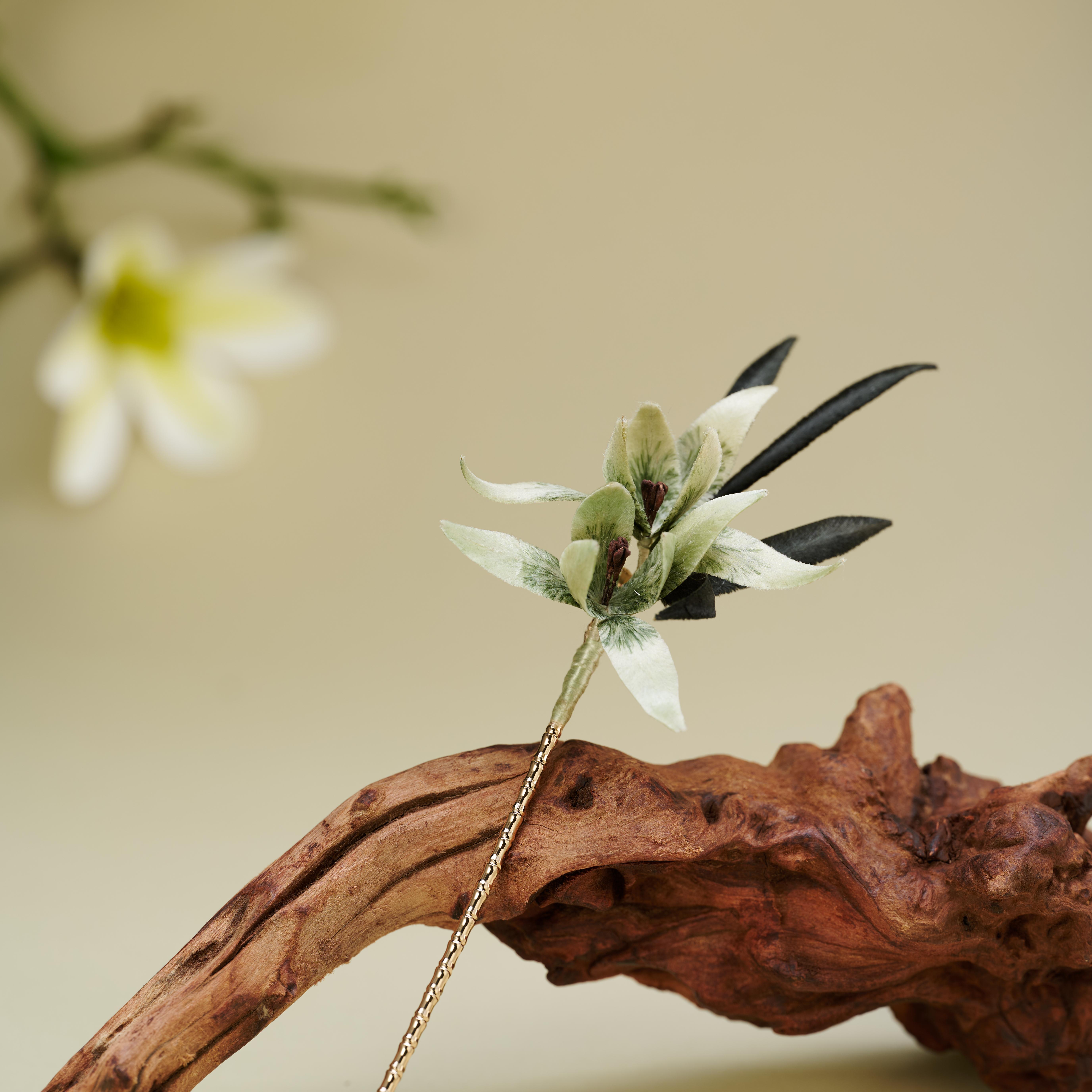 - Product Details: As a highlight of the Orchid Series, this hairpin draws inspiration from orchids, which symbolize noble and unsullied character in traditional Chinese culture.It integrates the meticulous gongbi painting techniques of the Song Dynasty — known for their precise lines and delicate details — with a modern minimalist aesthetic, creating a perfect blend of heritage and contemporary style.It freezes the most vivid moment of an orchid’s bloom: six petals unfurl gracefully, and curved veins on the leaves seem to carry the vitality of nature.The color, a gradient of emerald green, is borrowed from the lush bamboo forests after a Jiangnan rain — when light filters through the mist, dyeing the foliage with layers of fresh, tranquil green.When worn, it’s like having a“bamboo forest after rain”atop your head, evoking the poetic imagery of traditional Chinese landscapes.