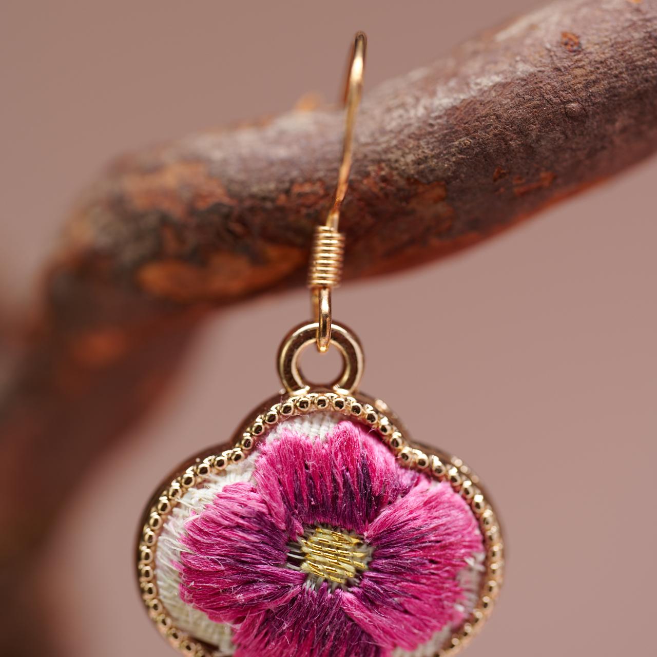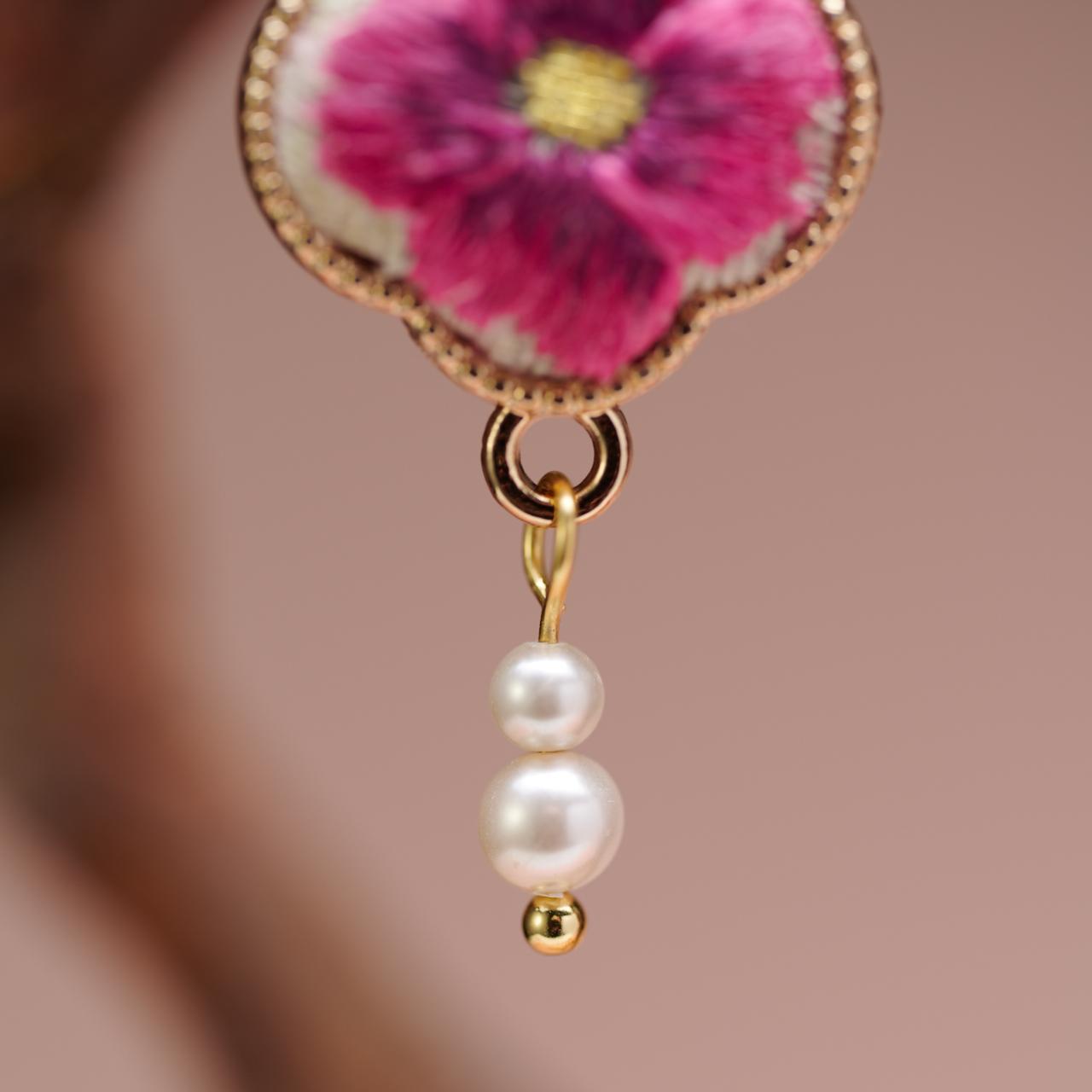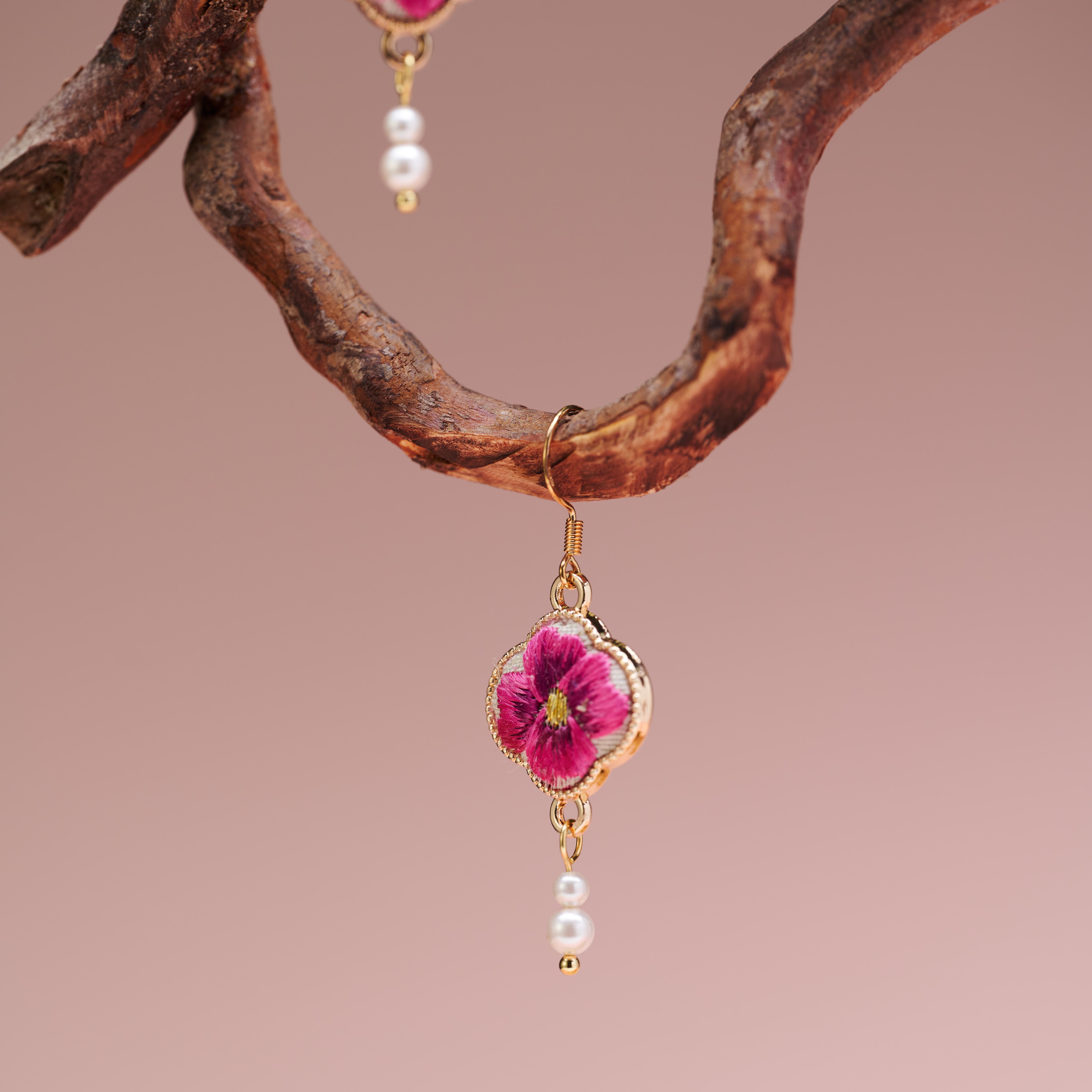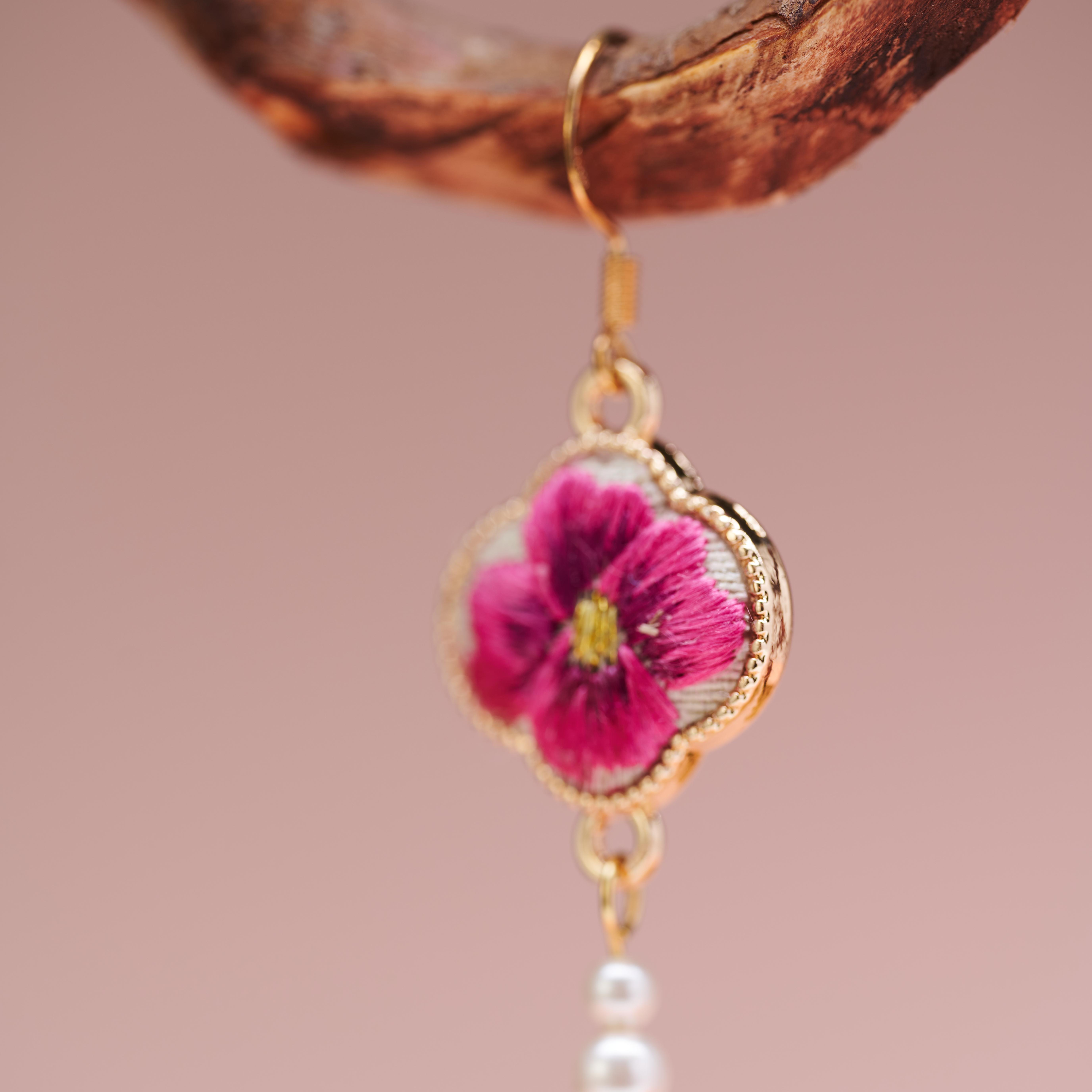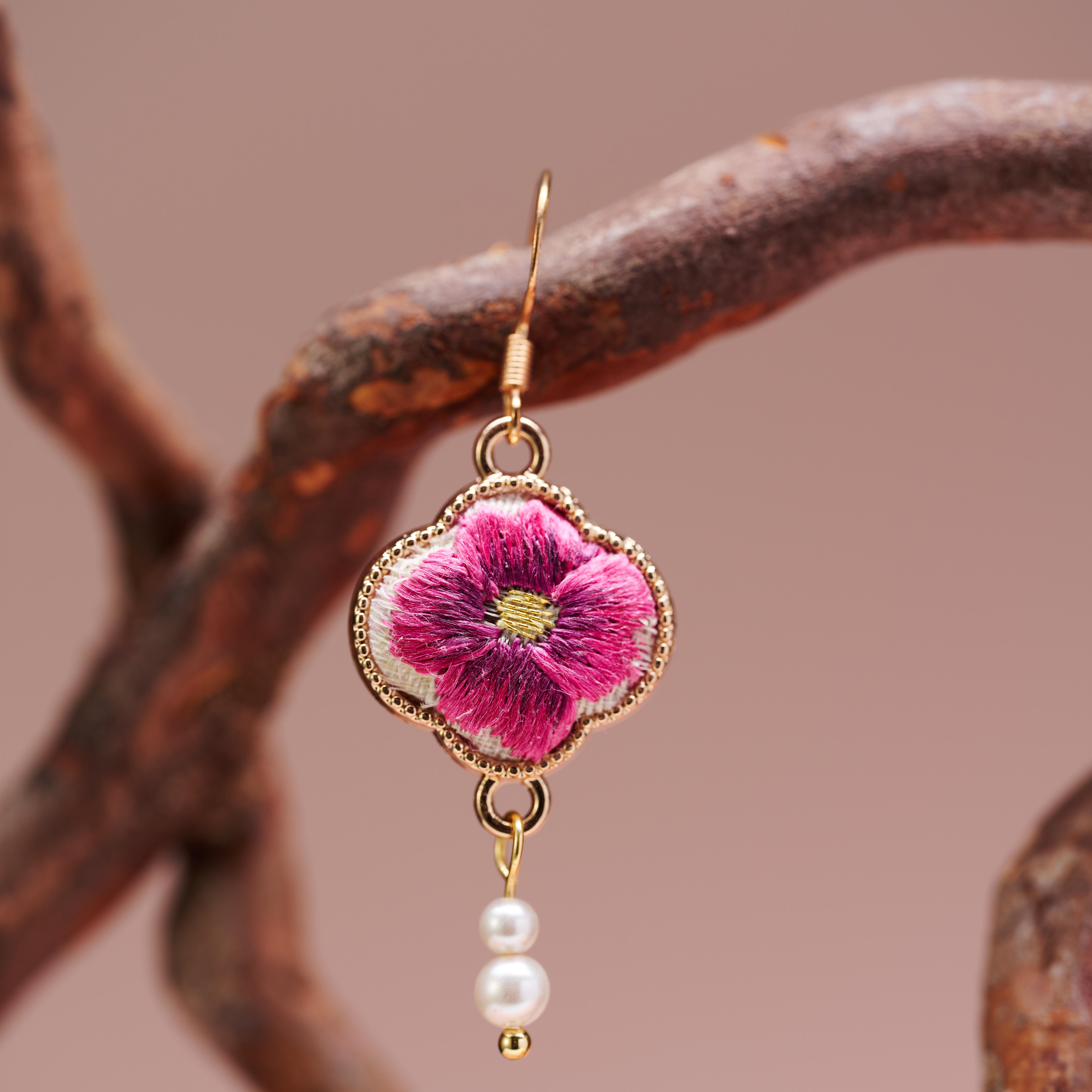 - Product Details:These earrings are made of real silk thread, 925 sterling silver pins, and an alloy base, with the craftsmanship of hand - embroidery. Centered around traditional Chinese embroidery techniques, the Begonia Flower Window Embroidered Earrings are exquisite accessories that blend the cultural imagery of begonias and patterns of classical window grilles. Inspired by the elegant artistic conception of "Begonia Flower Windows" in Chinese gardens, the outer contour of the earrings takes the arc - shaped waves of begonia petals, with an inlaid hexagonal window - pane pattern. This metaphorically represents the Eastern spatial philosophy of "flowers outside the window, and the window within the flower", combining the soft beauty of begonias with the geometric rhythm of window lattice. Through the expression of embroidery craftsmanship, it creates a wearable art that combines Eastern poetry and modern fashion.