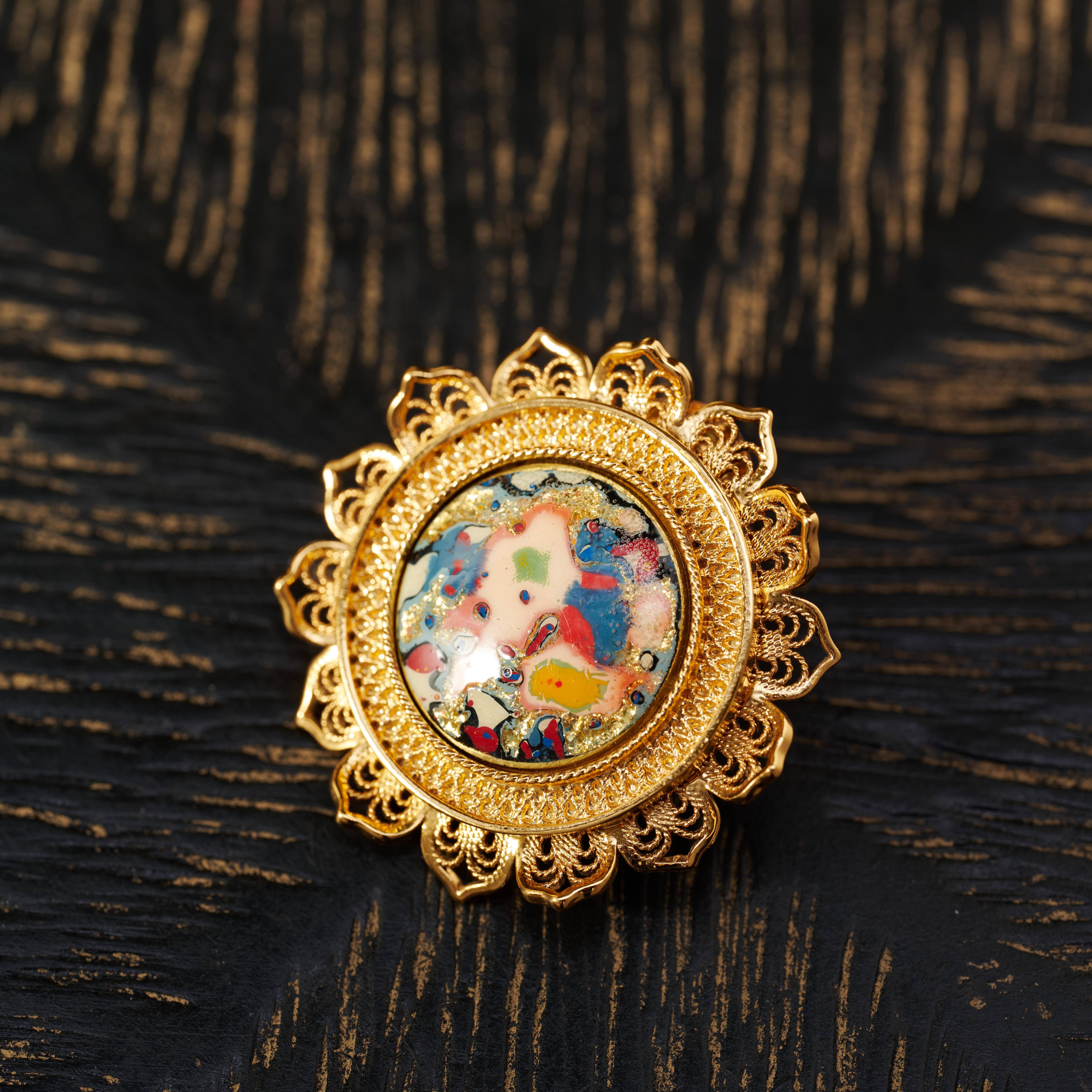 - Product Details:This brooch is made from a copper base, horse - hoof - skin lacquer, and gilded material. It's no ordinary brooch. It pairs well with the lapels of a suit, the frog buttons of a cheongsam, or even the casual plackets of a denim jacket. Positioned between the collarbone and the heart, it engraves the code of Eastern luxury civilization.The brooch is surrounded by 14 lotus petals that unfold, symbolizing the gradual sublimation of fearless spirit, which coincides with the vitality of modern women breaking free from constraints. The irregular pattern in the middle creates a visual impact, giving a modern yet retro feel. It shows off your elegance in daily wear and is an excellent choice.