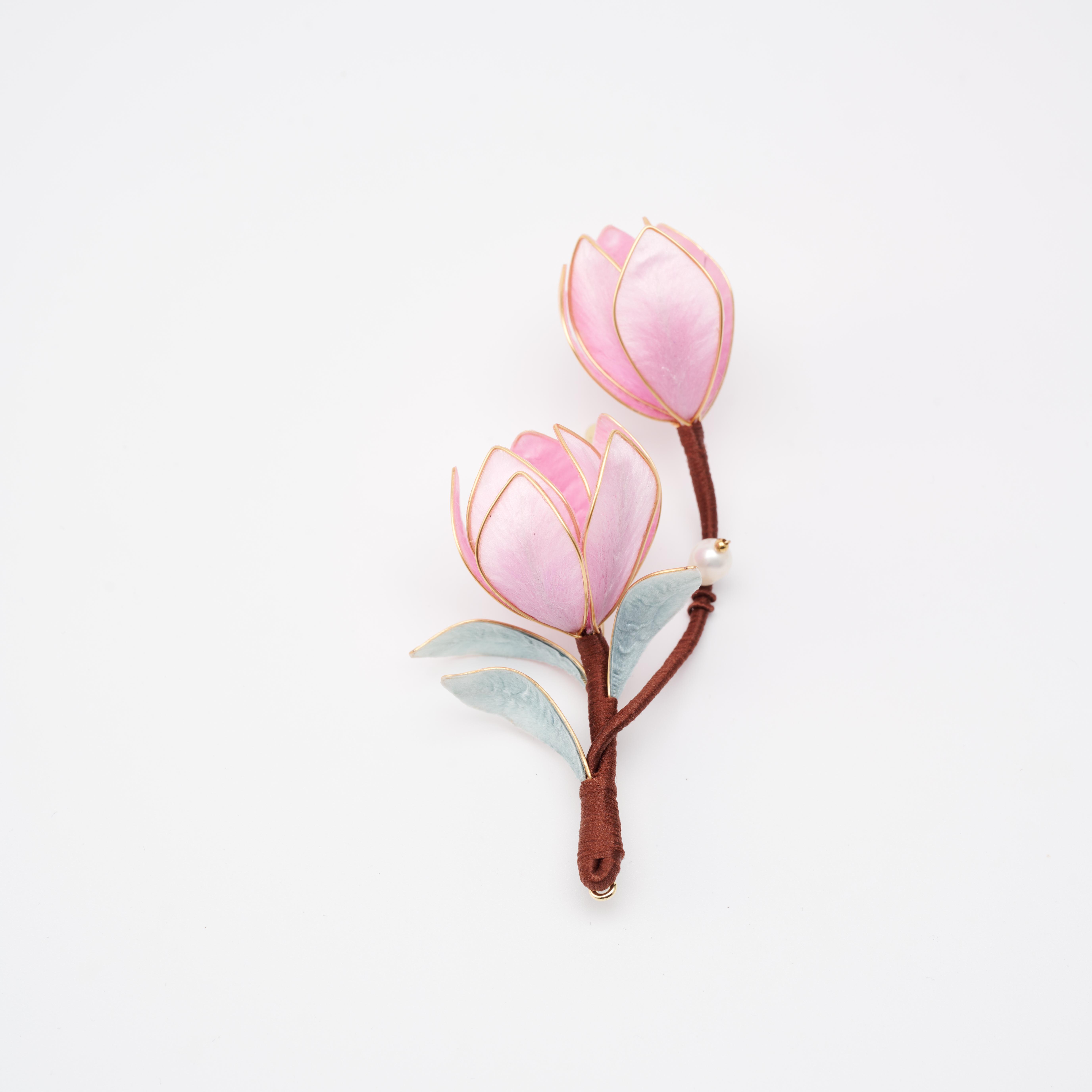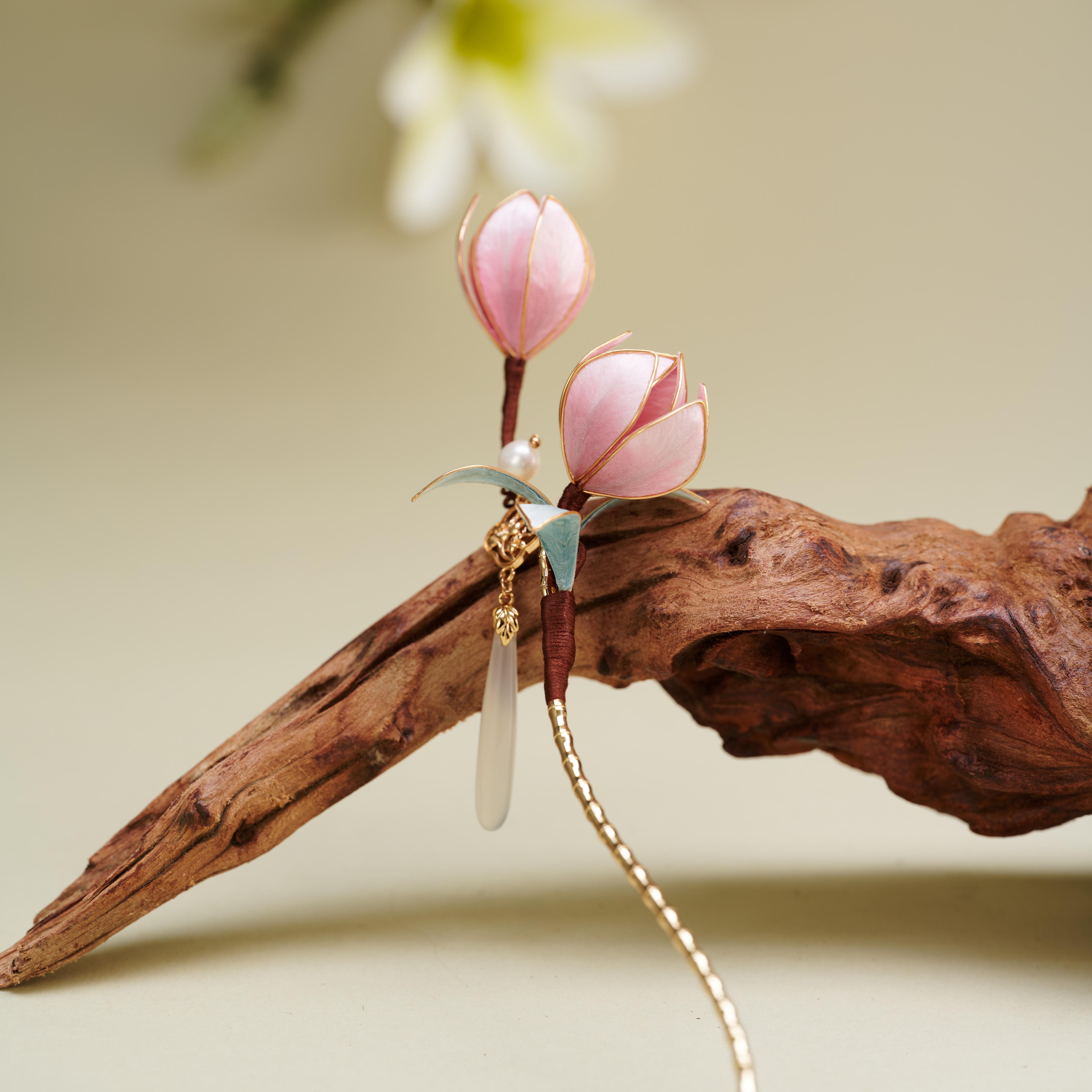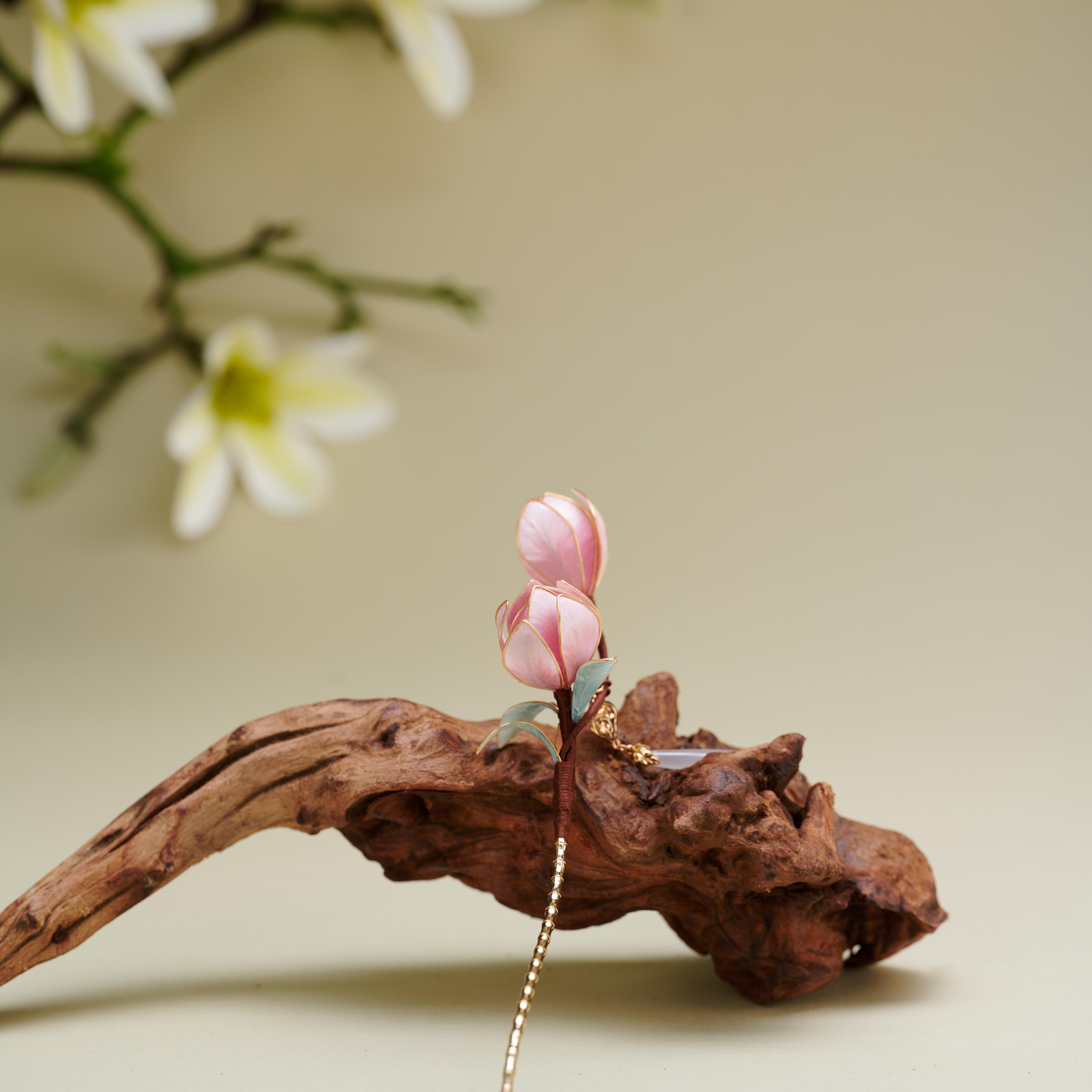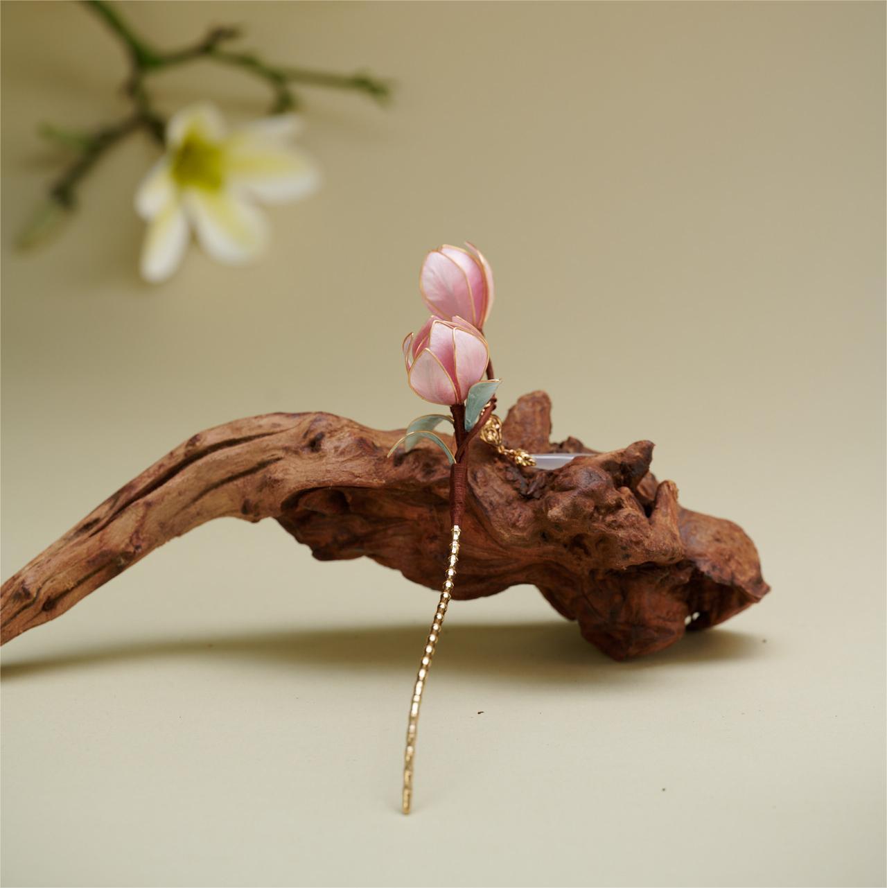 - Product Details: This hairpin is designed in the shape of a pink magnolia, exquisitely imitating the beauty of magnolias in full bloom. It is made of silk - like material. The size of the hairpin is 16*5cm. The petals are crafted from gradient - pink glazed ceramic, with seven layers of petals meticulously carved, which coincides with the time - honored saying of "the fragrance of flowers lingers" in the fourth lunar month.